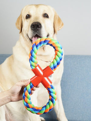 Cotton ropes are intertwined, twisted into fried dough twist, and then made into balls to make dogs more bite resistant and interesting
